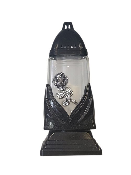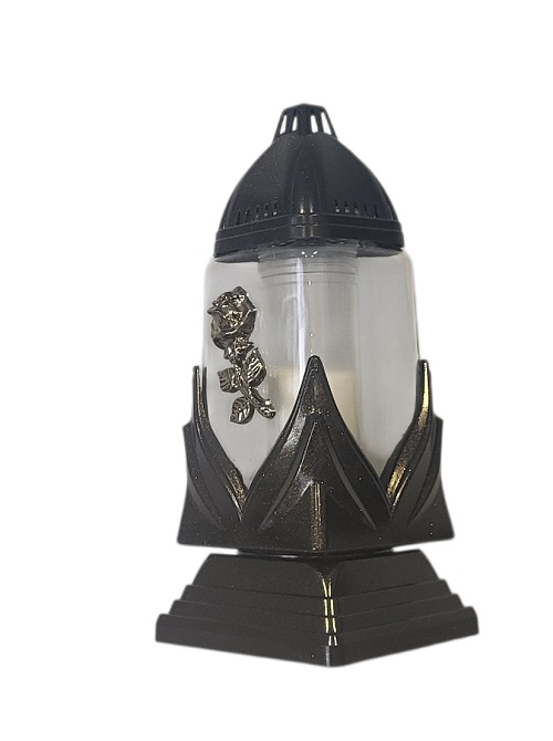 Žvakė į kapines, su juodos spalvos dekoracija , sienelės iš skaidraus stiklo,.priekyje sidabro spalvos rožytės aplikacia .Išmatavimai:pagrindas 13 x 13 cm. aukštis 30 cm