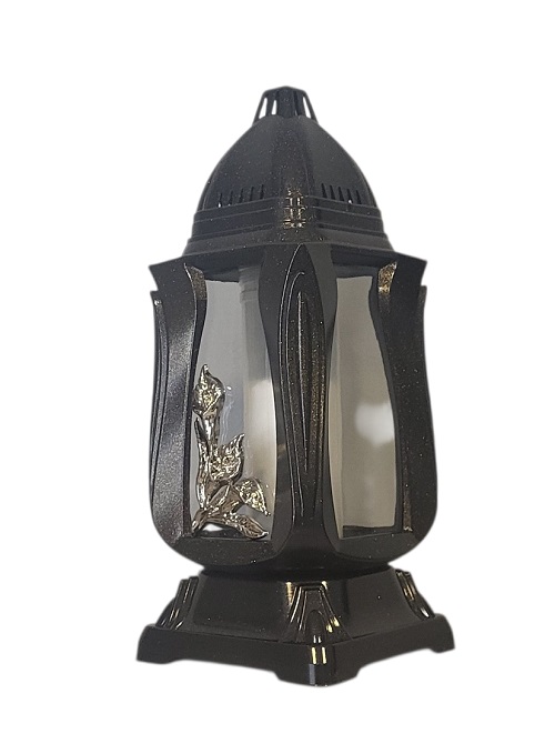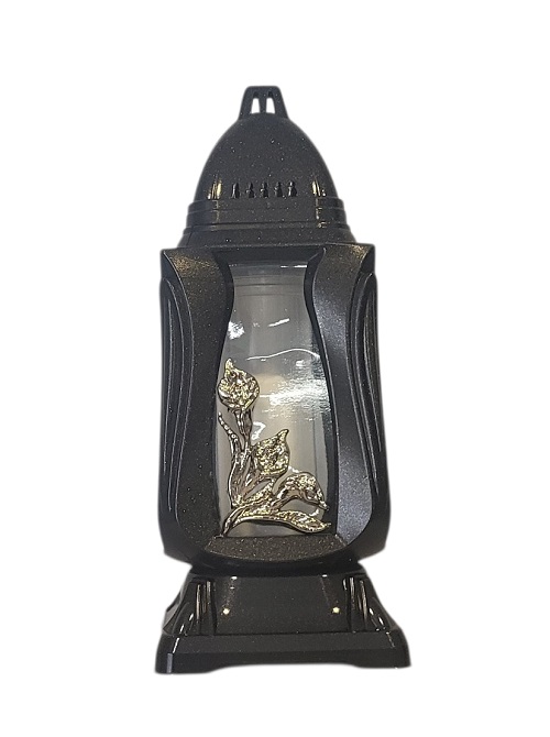 Žvakė į kapines, su paauksuotos spalvos dekoracija , sienelės iš skaidraus stiklo,.priekyje aukso spalvos kalijos aplikacija.Išmatavimai:pagrindas 13 x 13 cm. aukštis 30 cm