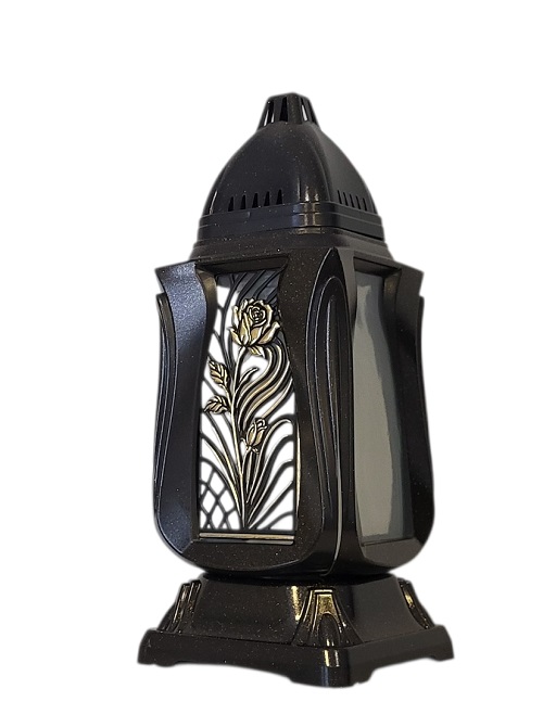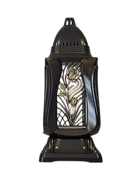 Žvakė į kapines, su paauksuotos spalvos dekoracija , sienelės iš skaidraus stiklo,.priekyje aukso spalvos ažūrinis ornamentas.Išmatavimai:pagrindas 13 x 13 cm. aukštis 30 cm