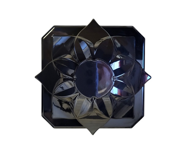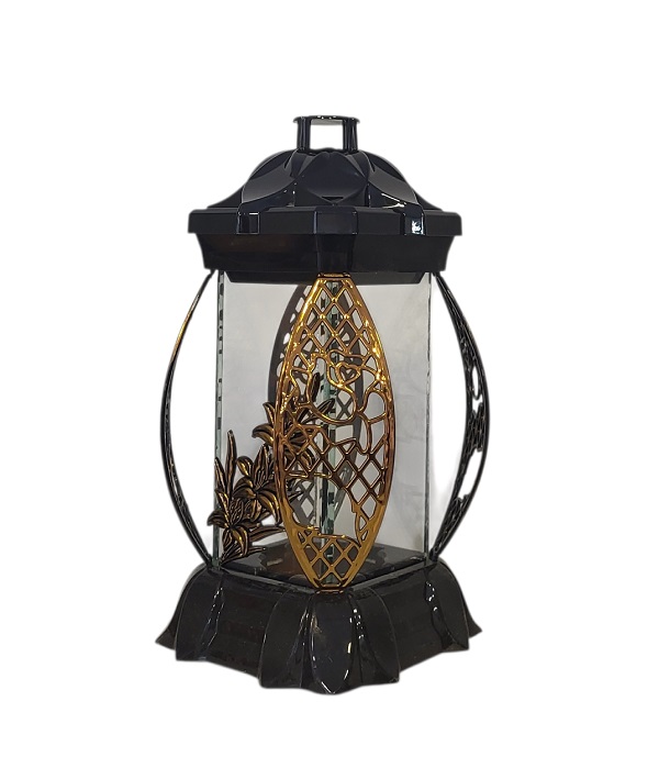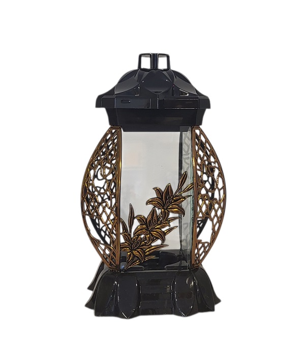 Žvakidė į kapines, kvadtatinė su vario spalvos ažūriniais kampais,Apačia ir dangtelis juodos spalvos plastikas , sienelės iš skaidraus stiklo.Priekyje vario spalvos gėlytė .Aukštis 27 cm. skersmuo 14 cm