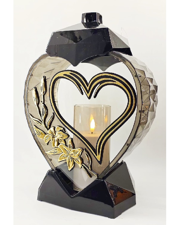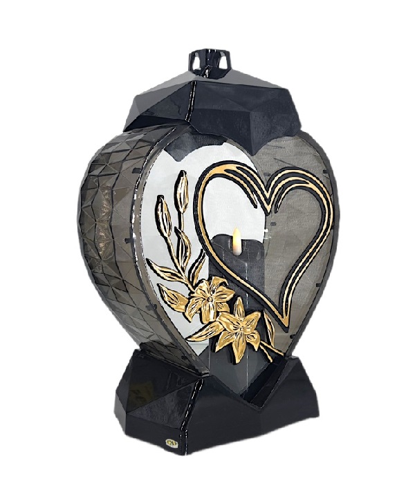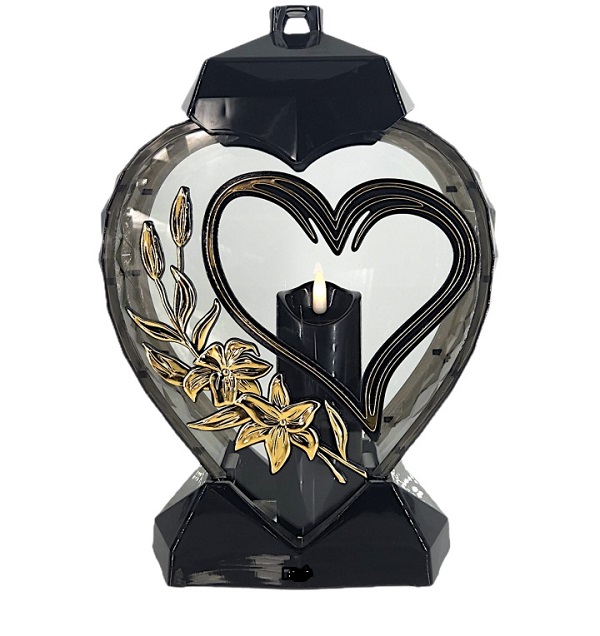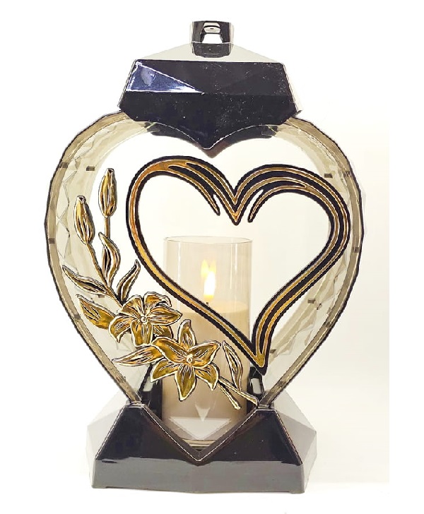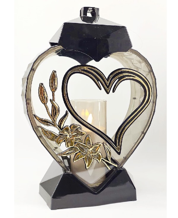 Žvakidė į kapines Z „Širdies formos žibintas su širdele ir gėle juodos ir auksinės spalvos” 33 cm