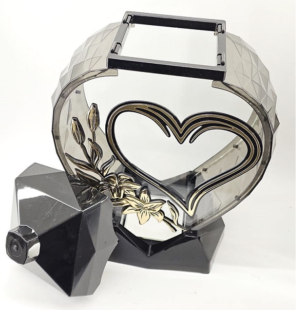 Didelis 33 cm širdies formos žibintas su širdele ir gėle juodos ir auksinės spalvos